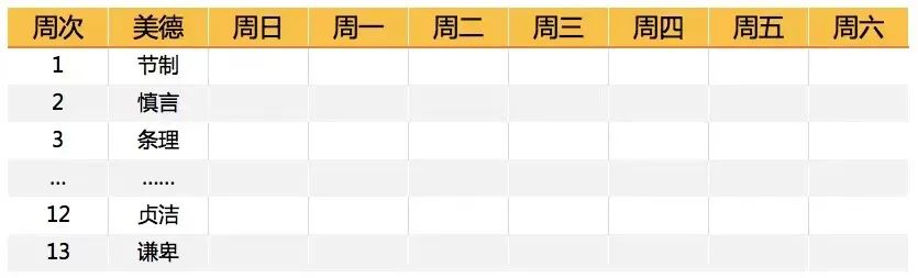 养成克己的习惯并不容易,如果想一步做到位,肯定是适得其反,美国总统富兰克林在养成克己习惯中列了十三个点,每周遵循一个,13周为一个周期,一年四个周期。